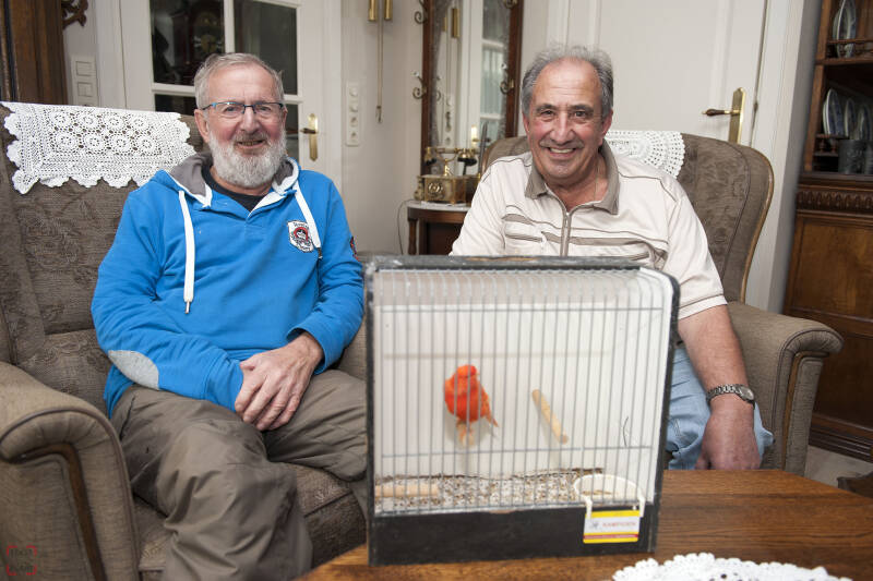 Voorzitter Rien Schout (l) met zijn roodschimmel kampioenskanarie op de koffie bij buurman én secretaris Dies Jeremiasse | © TekstEnPlaat.nl